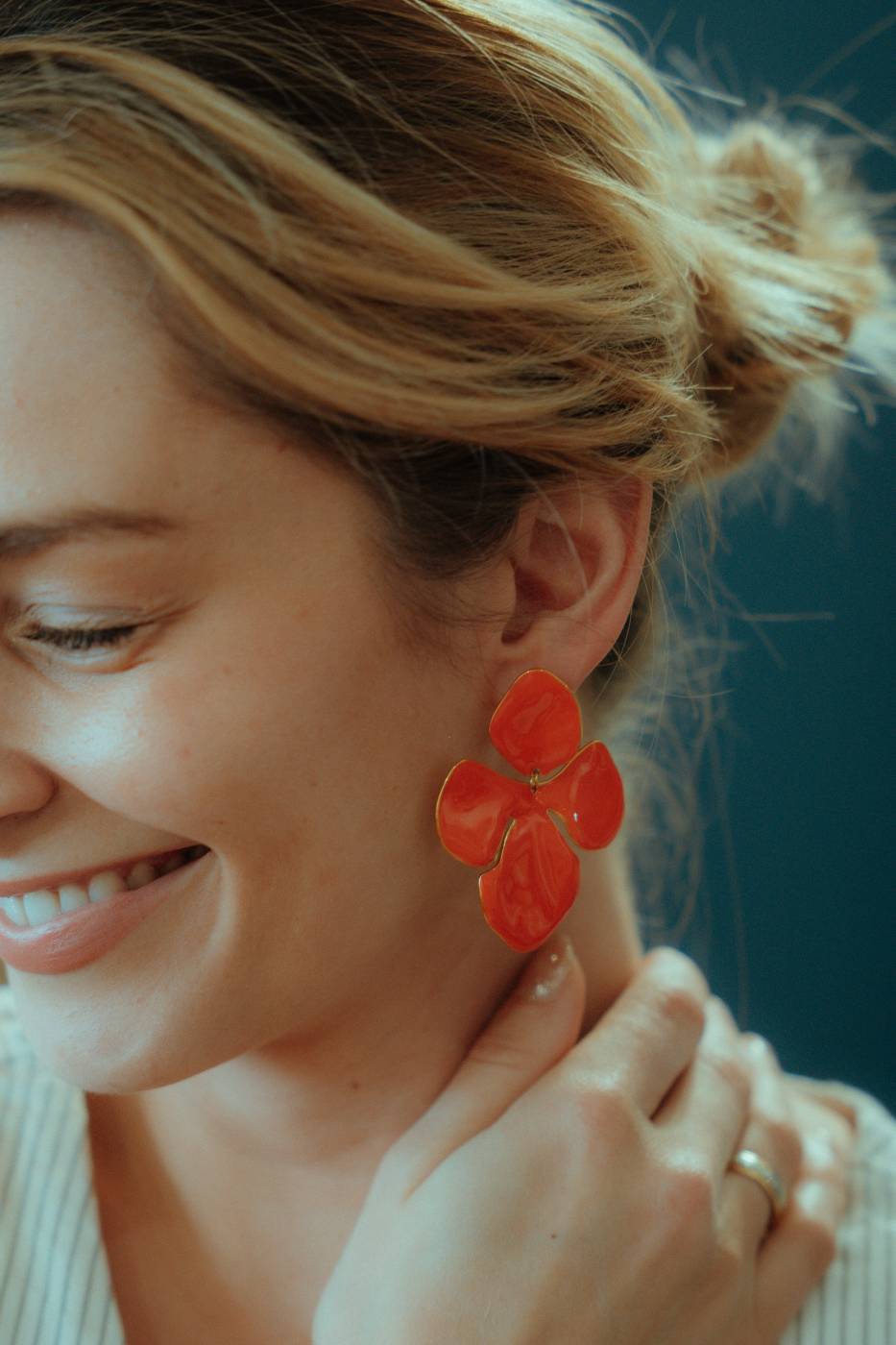 Cette paire de boucles d’oreilles fleurs XL, à pétales émaillées viendra “pimper” votre tenue d’une belle couleur orange.