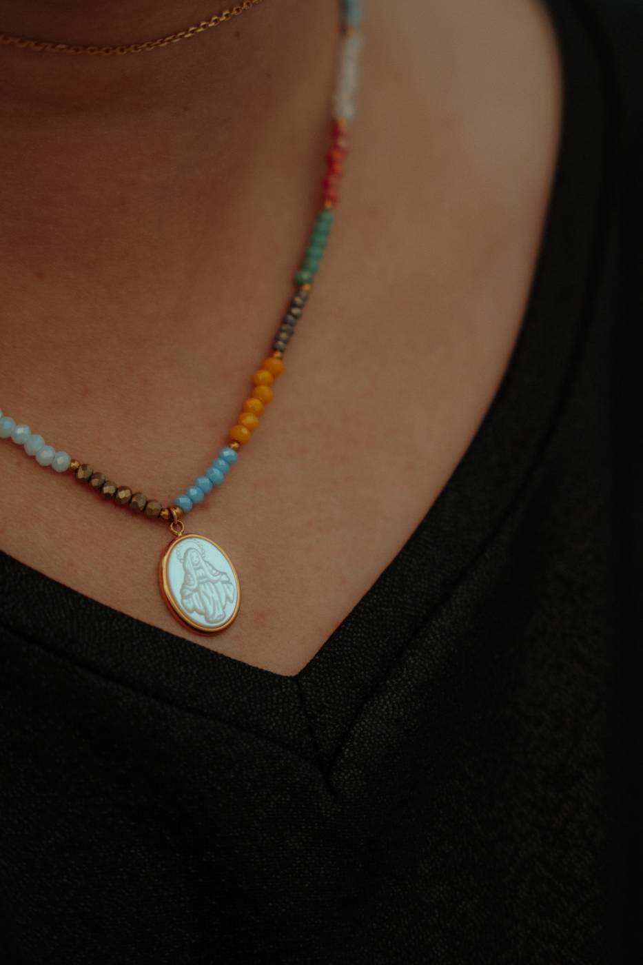 Ce joli collier est orné de perles de couleurs et surmonté d’une petite médaille de la vierge. Il est réglable. et peut se porter en ras de cou.