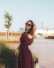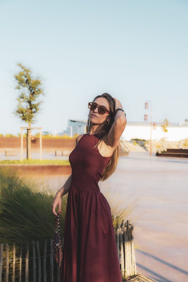Succombez à l’élégance intemporelle  de cette robe longue à smocks, confectionnée dans une magnifique teinte bordeaux.